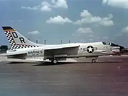 While aboard Bataan, the Checkerboards became the first piston engine squadron to shoot down a jet aircraft, when Captain Jesse Folmar shot down a MiG-15 jet fighter with 20 mm cannon fire.[15] On June 8, 1953, the Checkerboards were relieved by VMF-332, and returned to the United States in anticipation of transitioning to F9F Panthers at Marine Corps Air Station Miami, Florida.[16] On January 5, 1954 the departed MCAS Miami and joined Marine Aircraft Group 32 (MAG-32) at MCAS Cherry Point.[17] In November 1954, the squadron took possession of its new aircraft, the North American FJ-2 Fury. Another move came in November 1954 when the squadron arrived at the recently established MCAS Beaufort, SC. From October through December 1958, VMF-312 deployed to Guantanamo Bay Naval Base during the height of the Cuban Revolution.[18] During this time the squadron flew more than 1300 flight hours and shot more than 110,000 round of ammunition.[19]