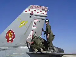 The Moonlighters arrived at Andersen Air Force Base, Guam, on 11 January 2002 and took over Operation Noble Eagle, relieving VMFA-212 and VMFA-232. During the squadron’s tour in Guam, they flew 262 sorties and amassed 582.7 hours of flight time.