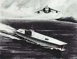 Zumwalt's successor as CNO, James L. Holloway III abandoned plans for the SCS and instead proposed a larger and faster design, the VSTOL Support Ship, or VSS.[1] By June 1976, it was planned that the VSS would be 690 feet (210 m) long and would be powered by four General Electric LM2500 gas turbines driving two propeller shafts (essentially double the machinery of the single shaft SCS) which would give a speed of 29 knots (54 km/h; 33 mph). It would carry 22 helicopters (16 H-53 Sea Stallions and six LAMPS light helicopters) together with four Harriers.[3] Holloway hoped to develop a series of advanced V/STOL aircraft, including a supersonic fighter and a utility aircraft for Anti-Submarine and Airborne Early Warning duties which could operate from the VSS as well as from the Navy's existing carriers, although these types were never fully defined.[3] The need to accommodate the new designs resulted in the carrier's design being reworked in February 1978 as the VSS II. This design had a larger hangar and greater beam than the original design to allow the potentially larger advanced aircraft to be carried, and carried substantially more aviation fuel.[1][4]