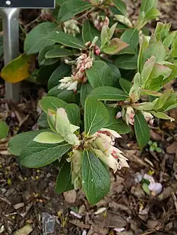 Vaccinium glaucoalbum, the grey-white blueberry, is a species of Vaccinium native to Nepal, east Himalaya, and Myanmar, and Tibet and Yunnan in China.[1] An evergreen shrub with white-bloomed black berries, it has gained the Royal Horticultural Society's Award of Garden Merit as an ornamental.[2] It grows in thickets and forest margins.[3] Local people collect and eat the fruit.[4]