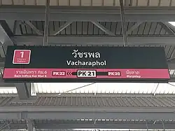 Vacharaphol station (Thai: สถานีวัชรพล) is a Bangkok MRT station on the Pink Line. The station is located on Ram Inthra Road, near the interesection of Ram Inthra Road with Chalong Rat Expressway in Bang Khen district, Bangkok.[1] The station has four exits.[2] It opened on 21 November 2023 as part of trial operations on the entire Pink Line. It is planned to be an interchange station with the MRT Grey Line in the future.[3][4]