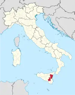 The province of Catania was one of nine provinces in the island of Sicily,[7] the largest island in the Mediterranean Sea.[8] It met the Ionian Sea at the northeast. The province of Caltanissetta and the province of Enna lay to the west, the province of Ragusa and the province of Siracusa lay to the south, and the province of Messina lay to the north. It also had the largest active volcano of Europe, Mount Etna. The provincial capital and largest commune was the city of Catania.[9]