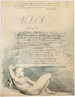 The poem was written on proof engravings of Night Thoughts. The lines are surrounded by large designs, and there are around 2,000 lines in the original version of the poem and 4,000 in the second version. The differences between the two versions are primarily in the last two "nights".[1]
