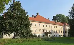 There is a large manor in the settlement, known as Lazzarini Manor (Slovene: Lazarinijeva graščina, Dvorec Lazarini), Smlednik Manor (Dvorec Smlednik, Grad Smlednik), or Valburga Manor (Dvorec Valburga). It was built in the 17th century. The main hall is painted with high-quality frescoes with mythological themes in the illusionist style. The painting in the chapel vault is believed to be by Anton Cebej.[4] After the Second World War, the manor was seized by the state and nationalized; from 1946 to 1990 the building was used as a special needs school.[10] The manor is being renovated after a fire in 2007 and is not open to the public.[11]