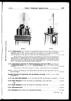 In 1907 the system was able to communicate between Lyngby and Newcastle with a 100-foot (30m) mast.[11] In 1908 Poulsen telephoned 145 miles (230 km) without wires from Ejerg to Lyngby in Denmark, using only 3 kilowatts, and in 1910 telephoned 295 miles (475 km) from Los Angeles to San Francisco in the United States, using 12 kilowatts. Music played in the Poulsen station in Berlin was received 215 miles (345 km) away at Copenhagen.[12]