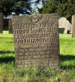 "Belvoir Angels" are a type of 18th-century Swithland slate tombstone found in the district.[2] A comprehensive account of the natural history of the vale was compiled in 1790 by the poet George Crabbe, who was chaplain to the Duke of Rutland and later concurrent Rector of Muston, Leicestershire, and the adjacent Allington, Lincolnshire. It includes a list of more than 70 beetle species.[3] The vale was renowned fox hunting country and had many historical ties to the sport.[4]