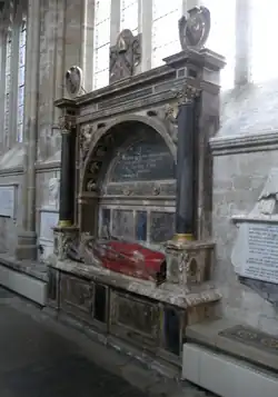 He died at his London townhouse in Drury Lane and was buried in Old St Paul's Cathedral, as he requested in his will should he die in London.[19] Any monument he may have had in St Paul's did not survive the Great Fire of London of 1666. His elaborate monument with effigy does however survive in Exeter Cathedral.[20]