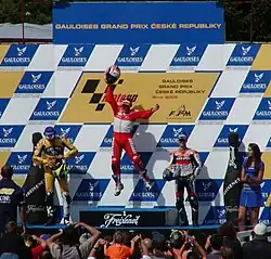 At the 1996 Austrian Grand Prix, Rossi achieved his first ever podium by finishing in third place after battling with Jorge Martínez.[23][24] In the following race, the 1996 Czech Republic Grand Prix, he achieved both his first ever pole position and his first ever race victory in the 125cc class. He rode an AGV Aprilia RS125R and won after another tussle with Jorge Martínez.[25]