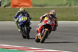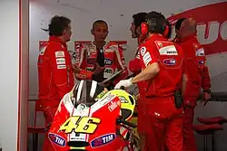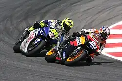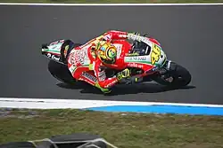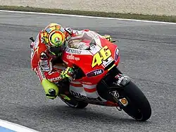 After graduating to the premier class in 2000, Rossi won the final 500cc World Championship (becoming the last satellite rider to win the top-class title until Jorge Martín in 2024) and the Suzuka 8 Hours race with Honda in 2001. He also won MotoGP World Championships with the factory Repsol Honda team in 2002 and 2003 and continued his run of back-to-back championships by winning the 2004 and 2005 titles after leaving Honda to join Yamaha. He lost the 2006 title with a crash in the final round at Valencia. In 2007, he ultimately finished third overall, before regaining the title in 2008 and retaining it in 2009.[5] After a 2010 season marred by a broken leg and no title defense, he left Yamaha to join the Ducati factory team, replacing Casey Stoner for the 2011 and 2012 seasons, and endured two winless seasons with the Italian marque.[6][7]