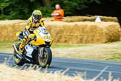 Rossi's first 500cc victory came after a fierce battle with the Suzuki of Kenny Roberts Jr. and the Aprilia of Jeremy McWilliams. On a track that was affected by ever-changing weather conditions and despite only qualifying in seventh position on Saturday, the Italian chose the right tyers and stormed through the field to battle with Roberts Jr. and McWilliams and win his first race in the 500cc class.[40][41] After his victory in Donington Park, Rossi went on to score consecutive podium places in the next three races: two second-place finishes in Germany and the Czech Republic and one third-place finish in Portugal.[42][43][44] He retired from the Valencian Community round after a crash.[45]