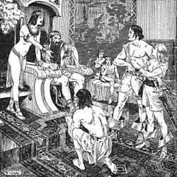 She was tall, full-bosomed, and large-limbed, with compact shoulders. Her whole figure reflected an unusual strength, without detracting from the femininity of her appearance. She was all woman, in spite of her bearing and her garments. The latter were incongruous, in view of her present environs. Instead of a skirt she wore short, wide-legged silk breeches, which ceased a hand's breadth short of her knees, and were upheld by a wide silken sash worn as a girdle. Flaring-topped boots of soft leather came almost to her knees, and a low-necked, wide-collared, wide-sleeved silk shirt completed her costume. On one shapely hip she wore a straight double-edged sword, and on the other a long dirk. Her unruly golden hair, cut square at her shoulders, was confined by a band of crimson satin.