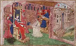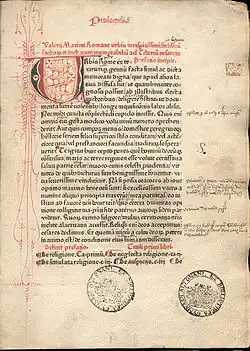 The collection of Valerius was much used for school purposes, and its popularity throughout the Middle Ages is attested by the large number of manuscripts in which it has been preserved: indeed, B. G. Niebuhr went so far as to claim that it was then "the most important book next to the Bible".[9] Like other schoolbooks it was epitomised: one complete epitome, probably of the 4th or 5th century, bearing the name of Julius Paris, has come down to us; also a portion of another by Januarius Nepotianus.[2] Only in the Renaissance, however, did it enter the central Latin curriculum in unabridged form, and it is then that its influence was arguably at its peak.[10] Dante for example used Valerius for details in his account of the generosity and modesty of Pisistratus.[11]
