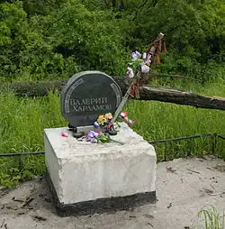 Kharlamov was still active with CSKA when he was killed in a car crash on 27 August 1981.[16] Prior to the crash, Kharlamov had been informed that he would not be a member of the Soviet team playing in the 1981 Canada Cup.[21] Coach Viktor Tikhonov said that Kharlamov was left off the team over concerns about his conditioning.[3] Irina, Kharlamov's wife, was driving back to Moscow from the family's cottage when she lost control and crossed into opposing traffic, hitting a truck head-on.[2] Irina did not have a driver's license at the time of the crash. When the bodies were recovered, Kharlamov was reaching over from his seat, holding onto the steering wheel.[3] Irina's cousin was also killed.[2] Fans lined the streets during his funeral procession in Moscow, and they filed past his casket which rested at centre ice of CSKA's arena.[3] Near the scene of the crash, a memorial stone in the shape of a hockey puck is inscribed, "The star of Russian hockey fell here."[16]