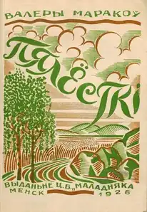 First verses of poetry by Marakou were published as Petals in 1925 (as stated by Leanid Marakou,[1] though the cover (illustrated) states 1926), and attracted the attention of the famous Belarusian poet Yanka Kupala who supported the young poet. During Marakou's short lifetime, four books of his poetry had been published.[1]