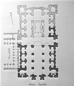The original design for this cathedral would have created a church which would have been the largest cathedral in Europe.[1] Initially planned as the cathedral for the capital city of Spain, ultimately only 40-45% of the intended project was completed,[2] due to lack of resources after the court moved towards Madrid, and the expenses caused by the difficult foundations of the building, which was located in an area with a large gap in the field.