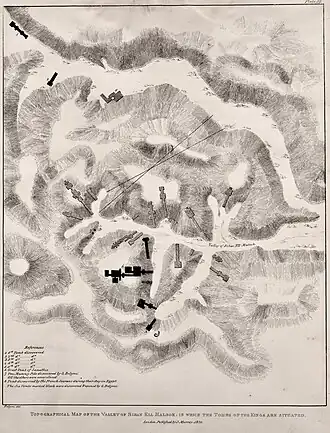 In 1799, members of Napoleon's expedition to Egypt (especially Vivant Denon) drew maps and plans of the known tombs, and for the first time noted the Western Valley (where Prosper Jollois and Édouard de Villiers du Terrage located the tomb of Amenhotep III, WV22).[45] The Description de l'Égypte contains two volumes (out of a total of 24) on the area around Thebes.[46]