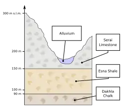 The Valley of the Kings is situated over 1,000 feet of limestone and other sedimentary rock,[11] which form the cliffs in the valley and the nearby Deir el-Bahari, interspersed with soft layers of marl. The sedimentary rock was originally deposited between 35 and 56 million years ago during a time when the Mediterranean Sea sometimes extended as far south as Aswan.[11] During the Pleistocene the valley was carved out of the plateau by steady rains.[12] There is now little year-round rain in this part of Egypt, but there are occasional flash floods. These floods dump tons of debris into the open tombs.[13]