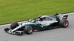 Bottas qualified and finished third in his first race as a Mercedes driver, the Australian Grand Prix, behind Sebastian Vettel and Lewis Hamilton.[73] At the Chinese Grand Prix, he spun behind the safety car and fell from fifth to 12th but recovered to sixth place by the finish.[74] He qualified fastest ahead of Hamilton at the Bahrain Grand Prix, marking his first career pole position.[75] Tyre pressure issues during the race contributed to him falling behind Vettel and Hamilton to finish third.[76] He qualified third behind the two Ferraris of Vettel and Räikkönen at the Russian Grand Prix, but overtook both on the opening lap and went on to claim his first Grand Prix victory, making him the fifth Finnish driver to do so.[77] He was able to continue after a first-lap collision with Räikkönen and Max Verstappen at the Spanish Grand Prix, but later retired from third place with an engine failure.[78] He benefited from damage to Vettel's car to finish second behind Hamilton at the Canadian Grand Prix[79] and followed this with a recovery drive at the Azerbaijan Grand Prix; a first-lap collision with Räikkönen had put him a lap behind but the red-flag period and multiple safety cars allowed him to catch up and pass Lance Stroll for second place metres before the finish line.[80]