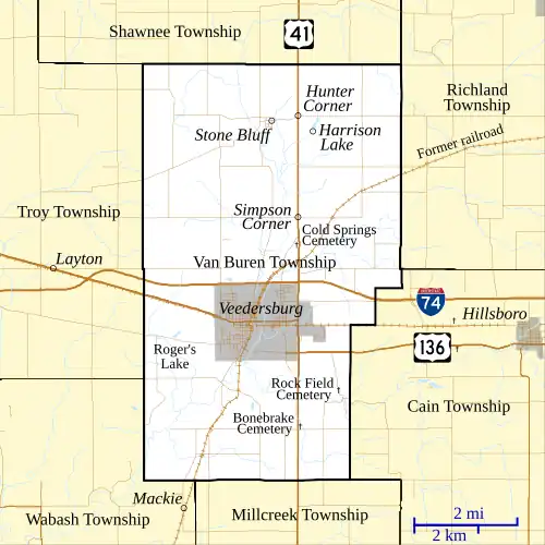 Van Buren Township is one of eleven townships in Fountain County, Indiana. As of the 2020 census, its population was 2,919 and it contained 1,306 housing units.[3]