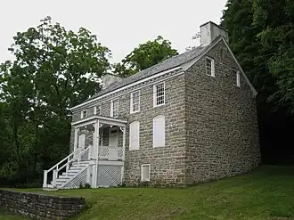 While it is called an "inn", it is more accurately a "yaugh house"—a rural residence in a remote area that was licensed under colonial law to provide food and shelter to travellers.[3] During the French & Indian War (1754–1763), the Van Campen's Inn "provided a safe haven when settlers fled for protection from Indian attack."[4] According to the National Park Service, in November 1763, 150 settlers sought shelter in the "stout walls" of the house against the threat of Indian attack.[6] During the American Revolution, John Adams is said to have rested the night at Van Campen's Inn while travelling from Massachusetts to Philadelphia for the Continental Congress.[4] According to the National Park Service, "In a December snowstorm in 1776, several regiments under General Horatio Gates marched south via Old Mine Road past this point and camped overnight on Shapanack Flats in front of Van Campen Inn. They then continued south to join General Washington in the Battle of Trenton."[6] Brigadier General Pulaski, a Polish count, and his command of 250 cavalry soldiers wintered here in 1778.[6] Van Campen served in the state legislature from 1782–1785.[7]