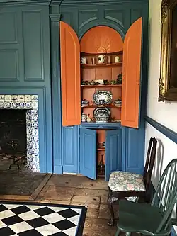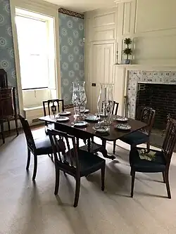 The dining room is in the eastern wing, separated from the eastern parlor by the rear hall,[189] and is designed in a late-18th-century style. It was likely not originally used for meals, as Americans generally did not have dedicated dining rooms prior to the American Revolution.[180] The dining room had a fireplace with a mantel from c. 1800,[170] which had ornamentation such as pilasters, sunbursts, and motifs of one-quarter of a fan.[180] There was a small closet built into the side of the fireplace mantel, which was used to keep items warm during winters. One corner of the room also featured a large white cupboard which was used to store porcelain.[190] The walls are made of light plaster above dark buff wainscoting, and a chimney occupies the north wall. Atop the wall was a ceiling molding, which likely dated from the 19th century.[180] An 18th-century ceiling molding and fireplace mantel were restored in a subsequent renovation.[191]