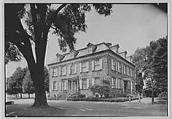 The house, designed by an unknown architect,[169] is built in the Georgian style and is 2+1⁄2 stories tall.[170][171] It was reportedly based on Philipse Manor in Westchester County.[60][99][172] The house has an L-shaped plan, with wings extending along the south and east sides.[157][170] The southern wing was probably completed first, followed by the eastern wing.[157] A lean-to was added to the house in the 19th century,[173] while a caretaker's apartment (adjacent to the main house) dates to before World War I.[157][128]