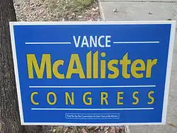 Vance Michael McAllister Sr. (born January 7, 1974) is an American businessman and Republican former member of the United States House of Representatives from Louisiana's 5th congressional district. He won a special runoff election held on November 16, 2013, for the seat vacated by fellow Republican Rodney Alexander.