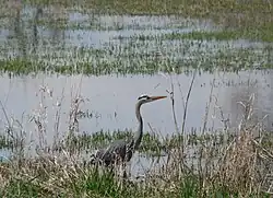 Vancouver Lake is home to a variety of wildlife species, many of which it shares with the nearby Ridgefield National Wildlife Refuge. Descriptions from the late 19th century describe Vancouver Lake as clear, up to 20 ft (6.1 m) deep and containing sturgeon. Current turbidity, more shallow depths and a lack of aquatic plant structures have diminished the variety of species and more recent surveys showed the most abundant fish by mass were brown bullhead, white crappie, black crappie, and common carp, with a few juvenile salmonids and a population of channel catfish, largemouth bass, bluegill, pumpkinseed, yellow perch, naturalized goldfish, northern pikeminnow, American shad, mosquito fish, largescale sucker, and freshwater sculpin.[5][6] Rich fringe environments provide habitat for amphibians such as tree frogs, reptiles such as garter snakes and a wide variety of birds, including large species such as great blue herons, osprey and bald eagles. It is within the Pacific Flyway. Large mammals on its banks include raccoons, a few black-tailed deer and an occasional coyote.