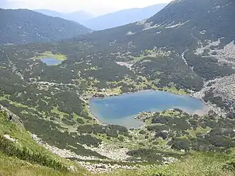 The upper lake is the larger one and is situated at an altitude of 2,268 m. It has an elongated kidney-like shape with an area of 26,200 m2. The lower lake is almost circular in shape and is much smaller, only 2,800 m2.[1][2] The shores of the lakes are steep and rocky. The surrounding slopes are overgrown with dwarf mountain pine (Pinus mugo).[1][2] The lakes are drained by the Vapa, one of the constituent rivers of the Belishkra reka, a right tributary of the Mesta. There are river trouts in the lakes.[2]