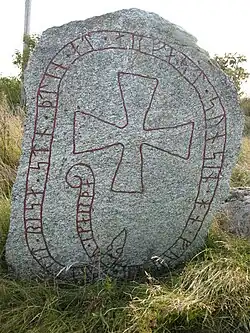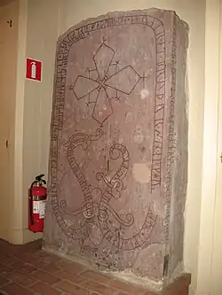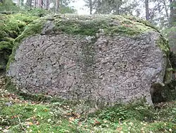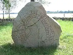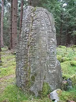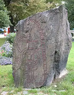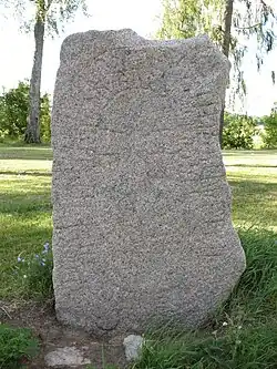 This is not properly a runestone but a runic inscription in style Pr4 that has been carved into flat bedrock at Veda. It is dated to the mid-11th century.[37] It was ordered by Þorsteinn who enriched himself in the lands of Rus' in memory of his son. Omeljan Pritsak identifies this Þorsteinn with Þorsteinn, the former commander of a retinue,[38] who is commemorated on the Turinge Runestone.[39][40] He suggests that Þorsteinn was the commander of the retinue of Yaroslav the Wise and that his son Erinmundr may have died in Garðaríki while serving under his father.[41]