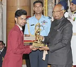 Varun Singh Bhati being awarded the Arjuna Award (2017) by the President of India, Ram Nath Kovind at Rashtrapati Bhavan in New Delhi on 29 August 2017