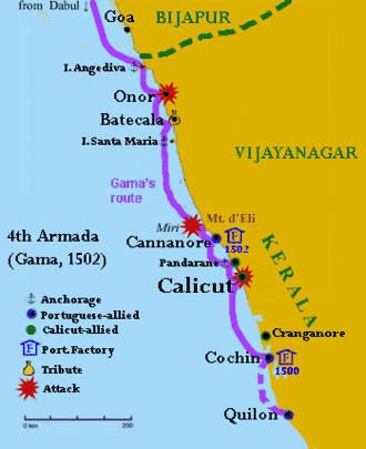 Malabar Coast of India, c. 1500, showing the path of Vasco da Gama's 4th India Armada in 1502