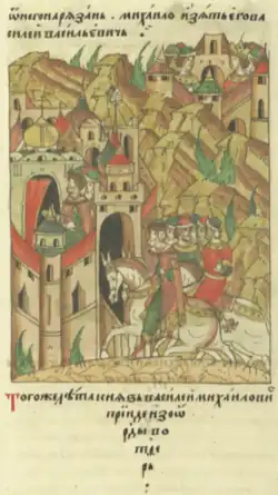 As four of the six nephews of Vasily, including Vsevolod, had died during a plague epidemic from November 1365 to February 1366, Mikhail Aleksandrovich strengthened his position in the principality by securing control over territories that had belonged to his brothers; in addition, Semyon, the son of Konstantin, bequeathed his father's inheritance of Bely Gorodok not to his brother Yeremey, but to Mikhail.[15] After Vasily's son Vasily Vasilyevich had died, his son Mikhail Vasilyevich asserted his right to the throne.[14] Mikhail Aleksandrovich knew that the grand prince, Dmitry Ivanovich, and the Russian metropolitan, Alexius, supported his uncle, so he went to Lithuania for support in 1367.[16] Vasily, along with Yeremey and his son Mikhail, launched a military campaign against Gorodok, where Mikhail Aleksandrovich had recently founded a fortress, but failed to take it.[16] Mikhail Aleksandrovich returned with a Lithuanian army for a surprise attack and he captured the wives of Vasily and Yeremey, as well as many of their boyars.[17] The two parties concluded peace and the Trinity Chronicle reports that Mikhail Aleksandrovich recognized the priority of his uncle Vasily as the legitimate grand prince of Tver.[17] The peace was fragile, as Yeremey broke the oath he made to Mikhail Aleksandrovich and went to Moscow, and Mikhail was pressured to cede Gorodok to Yeremey.[18] Vasily died on 24 July 1368 in Kashin while preparations for the next stage of the conflict were being made.[19]
