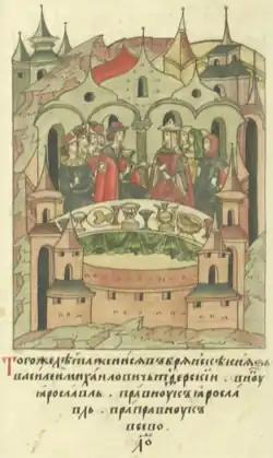 ![]() Vasily returns from the Horde, miniature from the Illustrated Chronicle of Ivan the Terrible (16th century) | |