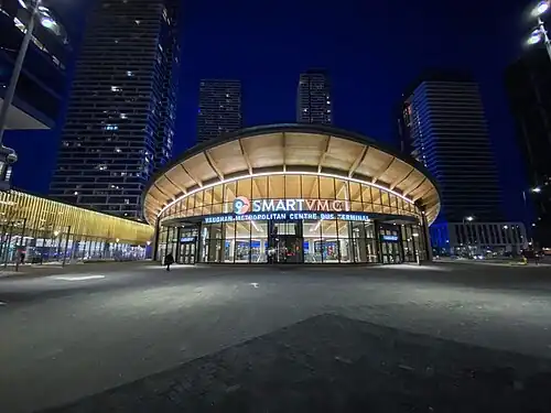 SmartVMC Bus Terminal (originally named SmartCentres Place Bus Terminal) is a YRT bus terminal on the northwest corner of Apple Mill Road and Millway Avenue north of the station,[28] outside the fare-paid area.[29][30] Diamond Schmitt Architects designed the terminal in a horseshoe shape. The building features open architecture that can be accessed from every direction. There is a passenger kiss-and-ride area on Millway Avenue and an underground walkway linking it with the subway station and Viva rapidway station on Highway 7.[28][31]
