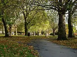 It was the wish of the blind MP Henry Fawcett that the park be created, and his former garden is one part of the park.[3] The design of the park was the work of Fanny Wilkinson, the first professional female landscape designer in Britain.[7] A statue of Fawcett by the artist George Tinworth was erected in the park in 1903,[8][9] but was removed by Lambeth Council in 1959 and has since been replaced by a plaque. Octavia Hill, a staunch believer that all people ought to have access to nature and open spaces, and the Commons Preservation Society successfully campaigned against development in the park in the late 19th century.[10]