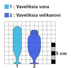 The typical Vaveliksia had a frankfurter-like appearance, with one end attached to the substrate by a disk-like holdfast. The body wall was very thin, and perforated. At the top was a hole, which may be an osculum, if they were indeed true sponges. In V. velikanovi, found only in Precambrian strata of the Dneister, the top has a crown of wrinkles which was originally interpreted as tentacles (the first fossils were originally thought to be of a polyp-like organism), and the holdfast is relatively flat and disk-like. V. vana, found at the White Sea shores and in Australia, is thinner in diameter, has an unwrinkled top, and the holdfast is much more convex or dome-like. Some specimens of V. vana also had arms.[4]