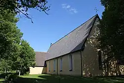 The oldest parts of the church date from the 13th century. It was later enlarged, and in the 15th century the church was vaulted, a church porch and a vestry was added and the church again enlarged. In the 17th century, a grandly designed burial chapel for the De la Gardie family was added to the church, designed by Nicodemus Tessin the Elder. The chapel was never entirely finished: it reached its current height in 1675 and work was then suspended. A temporary roof was not replaced with a more permanent one until the 1790s.[1]