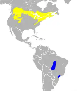 The breeding habitat is humid deciduous forest across southern Canada and the northern United States. Breeding habitat includes dense growth and dense understory close to a water source, such as a stream.[14] These birds migrate to eastern South America. It has been found that winter range may include the entire Amazon basin, Mérida state in Venezuela, the headwaters of the Orinoco River, and São Paulo state, Brazil.[15] Stopover regions during migration of several veeries from Delaware include the coast of the Gulf of Mexico, the coasts of the Carolinas, Cuba, Jamaica, Colombia, and Venezuela.[15] They are very rare vagrants to western Europe.