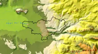 The Vega de Granada comarca is located in the central part of the province, at the eastern area of the depression of Granada and the neighbouring mountain ranges of Sierra Nevada, Sierra de Huétor and Sierra de la Alfaguara. It shares borders with the comarcas of Los Montes to the north, Guadix to the east, Alpujarra Granadina to the southeast, Valle de Lecrín to the south, Alhama to the southwest and Loja to the west.