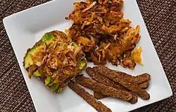 Vegetarian bacon can also be made at home by marinating strips of tempeh or tofu in various flavorings, such as soy sauce or liquid smoke, and then either frying or baking.[3] Aficionados of raw food also use coconut meat as a bacon substitute.[15] Seitan can also be formed into vegetarian bacon.[16][17][18]