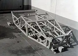 A backbone chassis is a type of automotive construction with chassis that is similar to the body-on-frame design. Instead of a relatively flat, ladder-like structure with two longitudinal, parallel frame rails, it consists of a central, strong tubular backbone (usually rectangular in cross-section) that carries the power-train and connects the front and rear suspension attachment structures. Although the backbone is frequently drawn upward into, and mostly above the floor of the vehicle, the body is still placed on or over (sometimes straddling) this structure from above.