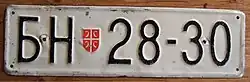 On the territory of the Croatian Republic of Herzeg-Bosnia, license plates were used similar to those of Croatia, with difference in the shape of shield in Croat coat of arms ("checkerboard"-"šahovnica").