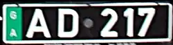 A new, European-style of registration plate was introduced on 1 September 2014. These have sets of two letters first and last (like French and Italian registration plates), with three numerals in the middle. A blue strip on the left contains the Georgian flag and a "GE", and there is a small security hologram on the bottom right.[2] As additional security features, the plates have a watermark-like symbol of the LEPL Service Agency of MIA of Georgia and a machine-readable data matrix code near the hologram. The old style plates with three letters, a hyphen and three numbers (e.g. ABC-775), in black on a white background, became invalid in September 2020. To accommodate owners of imported North American or Japanese vehicles, a more square styled plate is also available.[2]