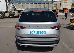 Dealer plates are light blue with the letters DLR and a serial number in white. These are usually magnetic plates, but also can be simply written on paper or cardboard etc.