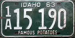 | 1959 | Embossed white serial on dark green plate with border line; "IDAHO 59" centered at top | "FAMOUS POTATOES" centered at bottom | A 12345 0/A 12345 |