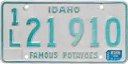- ^ Tanner, Eric N. "Idaho Passenger License Plates". allaboutlicenseplates.com. Retrieved November 11, 2020.