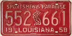 1958 | Embossed white serial with pelican separator on red plate with border line; "19 LOUISIANA 58" at bottom | "SPORTSMEN'S PARADISE" at top | 123-456 | 1-001 to approximately 880-000 | |