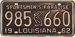 1962 | Embossed white serial with pelican separator on brown plate with border line; "19 LOUISIANA 62" at bottom | "SPORTSMEN'S PARADISE" at top | 123-456 1234567 |