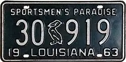 1963 | Embossed white serial with pelican separator on dark green plate with border line; "19 LOUISIANA 63" at bottom | "SPORTSMEN'S PARADISE" at top | 123-456 1234567 |